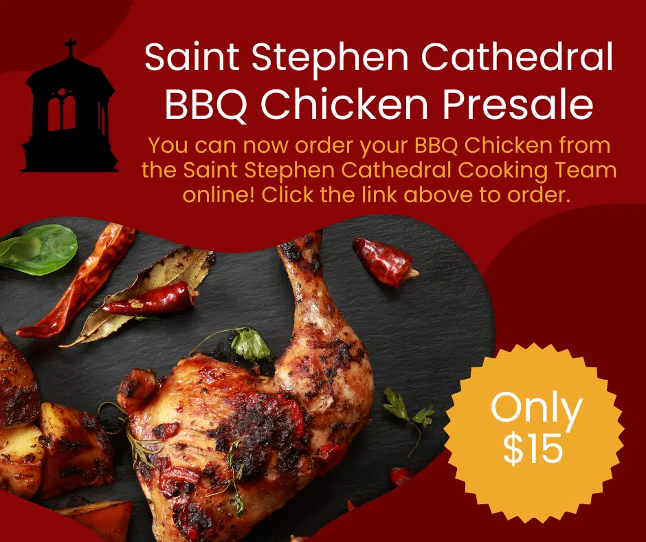 $15 per chicken. Pick up from Noon to 2pm on April 18th at St. Stephen Cathedral.