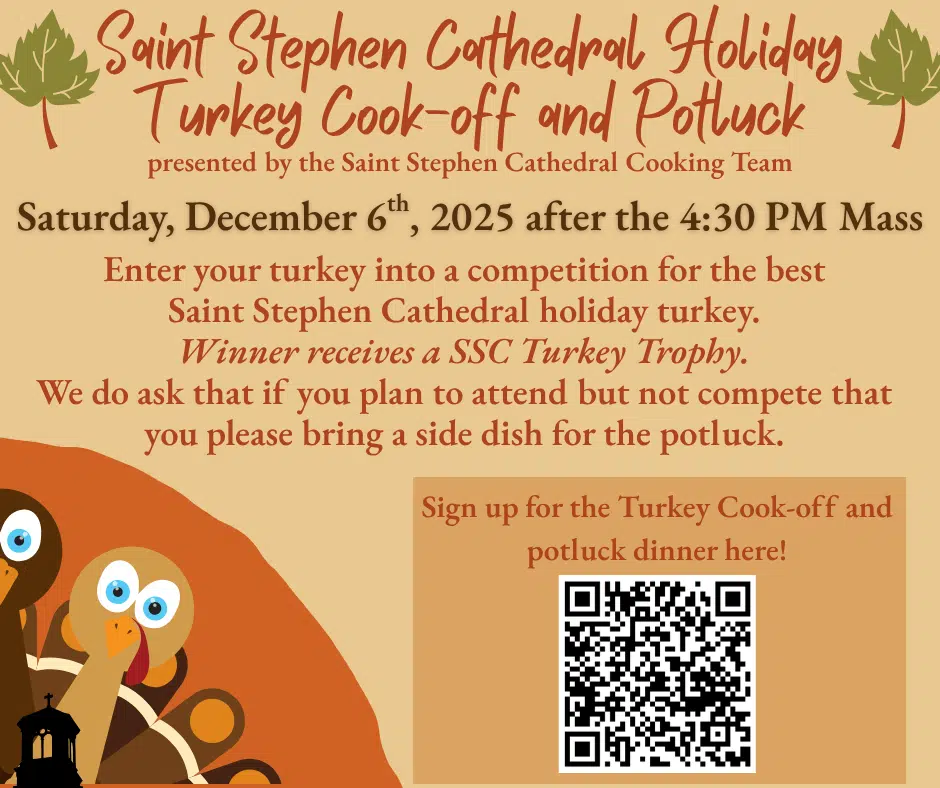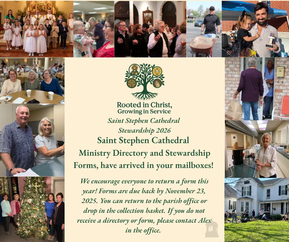 This year, St. Stephen Cathedral’s Locust Street location celebrates a major milestone – its 100th anniversary. To honor this occasion, we have arranged a variety of events throughout the year, including a service challenge, museum exhibit, cookbook, adoration, and more. The grand finale of our 100th anniversary celebration will be a special mass, presided over by Bishop Medley, on September 6, 2026. We extend a warm invitation to each family in our parish to participate in as many events as possible during this momentous year!
