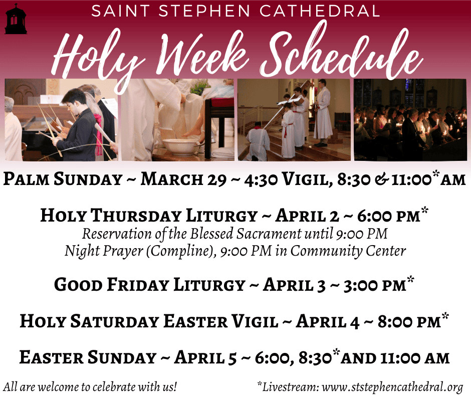 This year, Saint Stephen Cathedral’s Locust Street location celebrates a major milestone – its 100th anniversary! To honor this occasion, we have arranged a variety of events throughout the year, including a service challenge, museum exhibit, cookbook, Adoration, and more. The grand finale of our 100th anniversary celebration will be a special Mass, presided over by Bishop Medley, on September 6, 2026. We extend a warm invitation to each family in our parish to participate in as many events as possible during this momentous year!